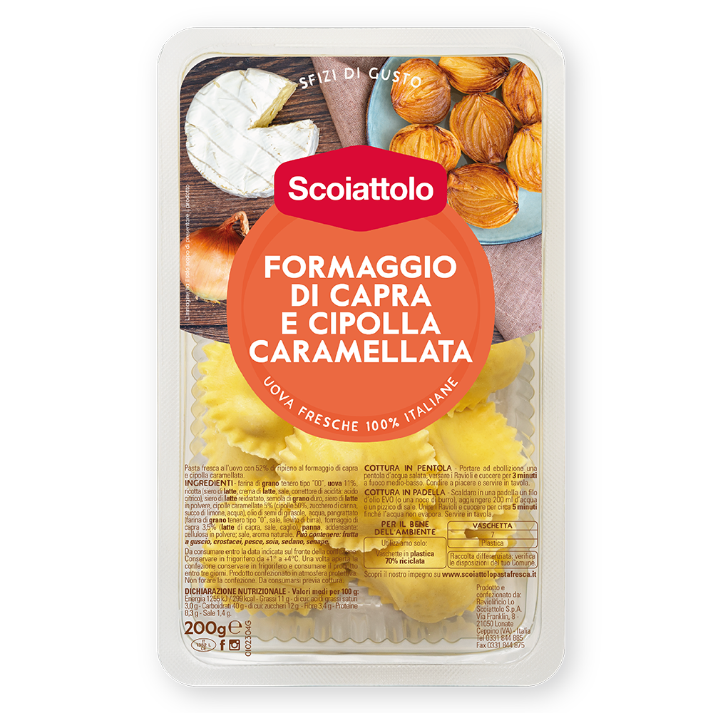 Verse pasta geitenkaas en gekaramiliseerd ui. Combineer met de notensaus.