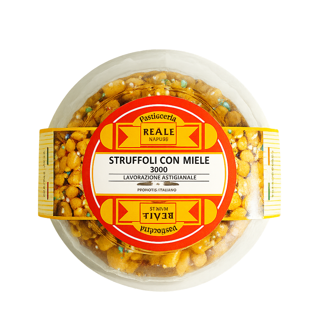 Knapperig van buiten, zacht van binnen en overgoten met warme honing: Struffoli zijn dé feestklassieker uit Napels. Deze kleine goudbruine deegbolletjes worden ambachtelijk gefrituurd, samengevoegd tot een geurige krans en versierd met vrolijk gekleurde suikerkorrels.